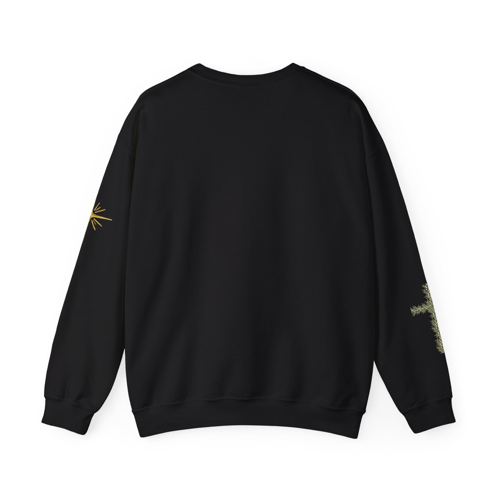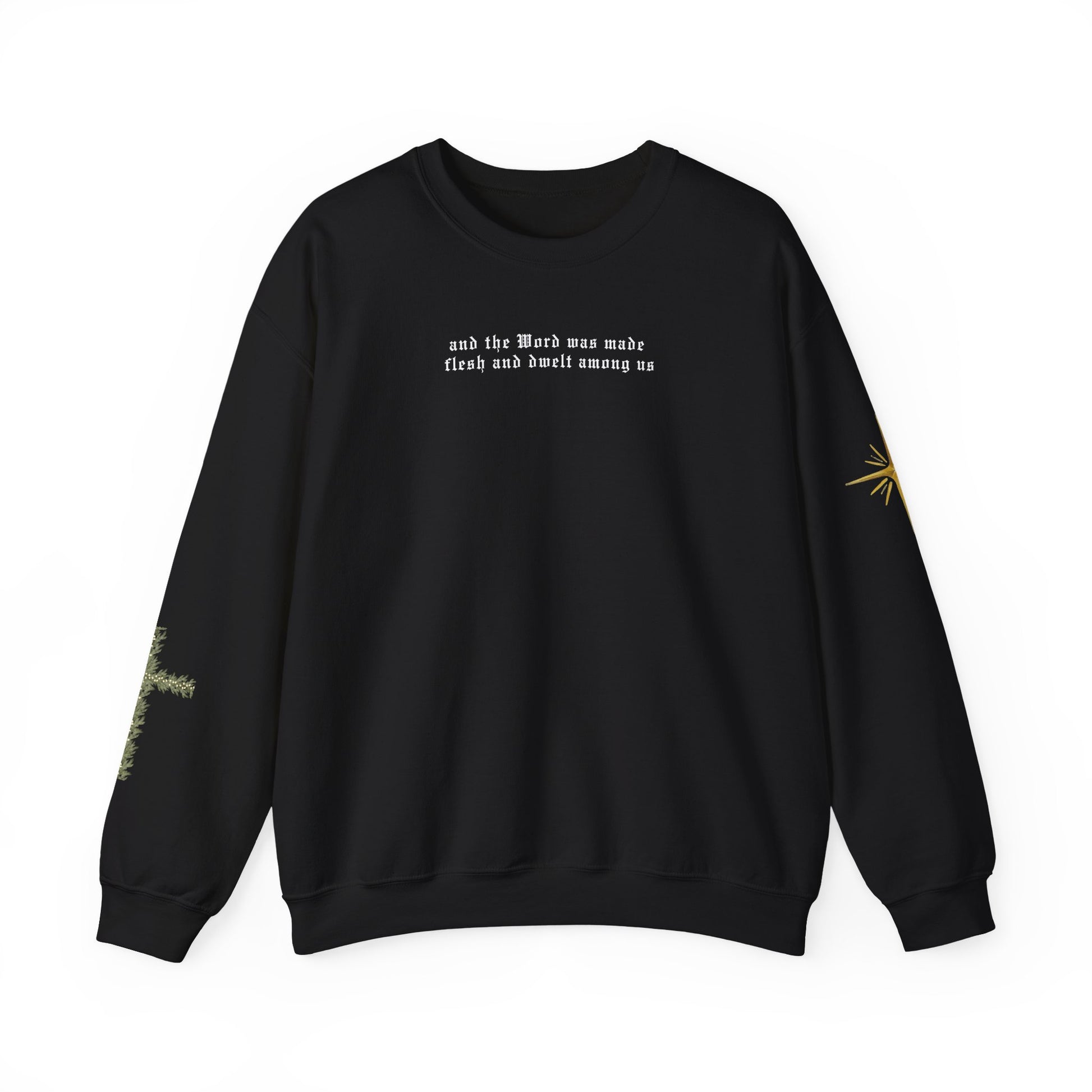 This minimal, scripture-forward crewneck features “And the Word became flesh and dwelt among us” printed across the chest — a quiet reminder of the miracle of the Incarnation. A gold Bethlehem star shines on the sleeve, and an evergreen cross on the opposite arm symbolizes life and hope and the true reason for the Christmas season. Understated, meaningful, and perfect for Advent, Christmas liturgies, or cozy days leading up to the celebration of His birth.